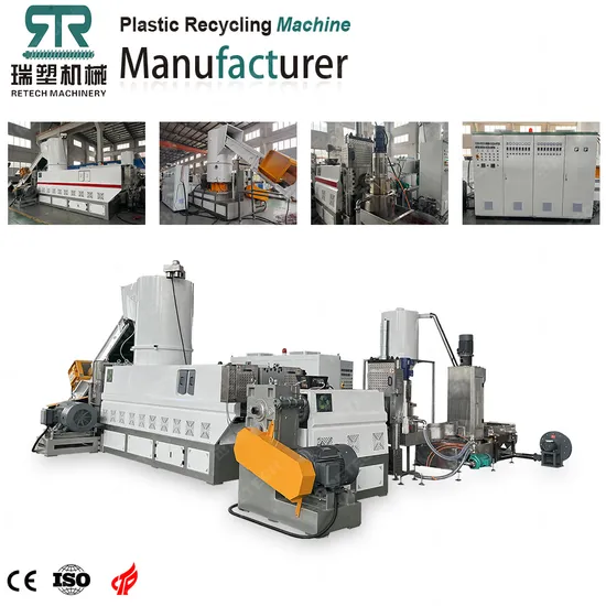Plastic film pelletizing line washed PP PE flakes granulator with CE Standard is the recycling machine which make the plastic into pellets. RETECH series compacting pelletizing system, it is a three in one recycling machine designed for low density plastic articles. It could provide the excellent re-pelletizing and recycling solution for film, raffia, filament, woven bag and nonwoven fabric and other consumed / post soft or rigid plastic. Our pellet making machine has a wide application in PE, PP, CPP, BOPP, PS, EPS, ABS, PA, PLA, PET waste plastic materials recycling field.