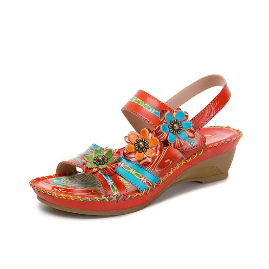 Product Description Occasion: Casual,Beach,VacationColor: OrangeClosure Type: Hook & LoopPattern: Floral PrintType: Wedges SandalsUpper Material: LeatherOutsole Material: RubberDesign Element: StitchingFunction: Hard-wearingGender: WomenToe Type: OpenedHeel Height: 3-5cm In Low HeelHeel Type: Wedges HeelStyle: Retro,Boho,EthnicSeason: Summer
