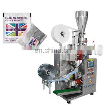 Automatic small dip tea envelop packing machine price inner and outer tea bag packing machine drip tea bag packaging machineMachine IntroductionDession multi-functional tea packaging machine suitable for all kinds of teabag packaging.Such as bulk tea, herbal tea, health tea, flower tea, tea powder, coffee powder and other internal and external bags are disposable packaging.One machine for multiple purposes. Various packaging types are available upon request. Including tea sachet, single chamber tea bag with tag, double chamber tea bag with outer envelope.Machine ParametersModel NO.DS-T-C18MeasuringVolume measuring cupFilling Range3~15 ml(g)Packing Speed40~60 bags/minInner Bag SizeL:50-70mm,W:40-80mmOuter Bag SizeL:70-120mm,W:60-90mmTag SizeL:20-24mm,W:40-55mmThread Length155mmPower220V,50Hz,1.9KWMachine size1750*740*1950 mmMachine weight550KGMachine Characteristic1.The section where the material contact is stainless steel as the body of machine is optional for complete orpartial stainless steel and all out equipments have passed the CE Standard.2.High-sensitivity photoelectric color tracing and digital input of cutting position get more accuracy.3.Embedded sealing , enhanced structure of heat sealing intelligent temperature controller and excellent heat balance make all kinds of packaging materials possible with good performance, low noise, clear cutting pattern and strong sealability.4.Packaging speed and length of bags can be set to some extent without further adjustment and parts changing. Packaging speed and length of bags can be set to some extent without further adjustment and parts changing.Machine DeatilsThe machine is easy to operate and all settings can be controlled on the touch screen.Simply set the parameters on the screen, equip the wrapping film and install it on the machine, and the machine can be started. Put the product into the hopper, the machine will automatically pull the film, make the bag, seal, and finally cut the bag. You can get a beautiful tea bag.Machine Control CenterHuman machine Interactive interface. Easy to control and adjust. The language is customized according to customer specific requirement.Independent temperature control device for each part of the machine, easy to adjust.Measuring Cup Measuring DeviceAdopts the volumetric cup. It can be widely applied to the little granule.Not only for crushed tea.But also the coffee powder.The accurate can reach at ± 0.1.Tag and Thread Making DeviceLabels of the required size are automatically made and wired on the tea bags. If not needed, it can be turned off manually.Inner Bag Making DeviceThe corresponding bag maker can be replaced according to the size requirements.After the inner bag is made, the robot automatically picks up the finished inner bag tea bag and puts it into the outer bag device.Outer Bag Making DeviceThe whole machine adopts 3-sides heating sealing.The temperture can be easily adjusted based on different kinds of packing materials.Machine Packaging Effect DisplayThe inner and outer bags are packaged with three-side sealing. It can be equipped with nitrogen filling device and date coding device according to requirements.Why Choose UsVR1. Professional and Strong TeamDession has a professional team that can provide customers with various packaging solutions. After fully understanding the customer's needs, we provide the most suitable packaging solution to the customer. Then start the production of the machine. We have a strong production and processing capacity, from the customized processing of accessories to the assembly and debugging ofthe machine. Finally, it is packaged and shipped, and it only takes a week to complete.2. Timely and effective after-sales serviceChoosing us is not only buying a machine, but also our professional and timely service. 1. When the machine is delivered, we will attach a video of the installation and operation of the machine, so that you can use the machine quickly. 2. All electrical appliances of our machines have a one-year warranty, and we will replace them if they fail. 3. When your machine fails, we will have professional engineers to provide professional online after-sales service to help you solve the problem. 4. If the problem cannot be solved online, we will arrange an engineer to repair it on site within a week.Buyer FeedbackWe have 8 years of experience in foreign trade and export, and now our customers have spread to 90 countries all over the world. With our high-quality machines and professional services, we have won unanimous praise from our customers.Company ProfileDession a leading manufacturer of Packaging machine and supporting facilities, which has successfully developed more than 80 kinds of packaging machines. Dession Packaging Machine has widely applied for different fields throughout the world, such as food/ industrial food, medicines, hotel supplies, disposable goods, rubber goods, daily appliances, hardware fittings, sporting goods, toys etc. Dession has more than 8000 square meters of production plants, 5 production workshops and a parts processing workshop, including small vertical machine production workshops, vertical machine production workshops, pillow machine production workshops, cartoning machine production workshop and filling machine production workshop.FAQQ1:Do you have manual or operation video for us to know more about the machine? Yes, not only manual or operation video, 3D drawing also available to make as per your design,also the video we can make of testing the material from our packaging machine if your packing goods easier for us to find from our local market. Q2:How can I trust you for the first time business ?Please note our above business license and certificate. And if you don't trust us, then we can use trade assurance service, guarantee your money, and guarantee your machine's on-time delivery and machine quality.Q3:Is engineer available to serve oversea?Yes, but the travel fee is paid by you. So actually to save 