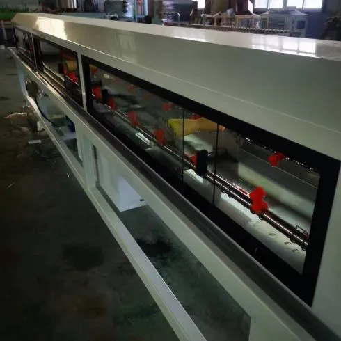 Cooling tank is used to cool pipe further Pneumatic solenoid valve control automatic drainage, with rapid cooling molding characteristics The temperature control meter controls the temperature of the water tank and automatically provides water supply and drainage. High speed extrusion line, large diameter pipes or thick pipe wall pipes extrusion line should equip with one or two spraying water tank.