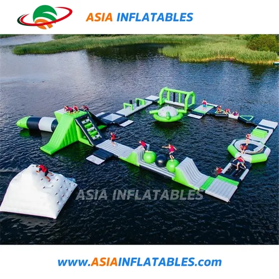 We use 0.9mm commercial grade reinforced PVC tarpaulin(Waterproof & flame resistance) to make all the Inflatable Water Parks with hot-air machine. And we will make the size and colors according to your requirements.