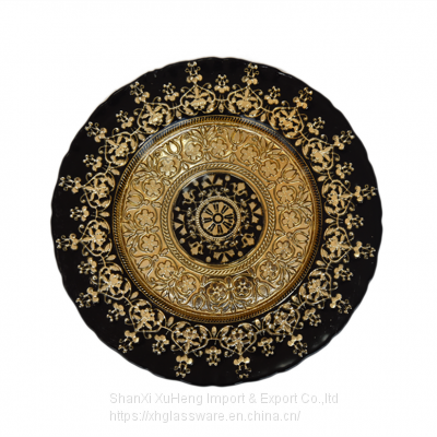 Black Colored Glass Charger Plate With Gold Flower Decoration For Wedding