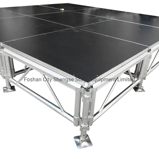 Aluminum alloy is the main material used in mobile assemble stage. Aluminum stage are available in different size, Each size of dance stage can be joined with another via a unique built-in platform connector system. The lightweight frame is made from high quality aluminium alloy, 18mm thick slip- resistant laminated plywood and are beard at 750kg per panel.