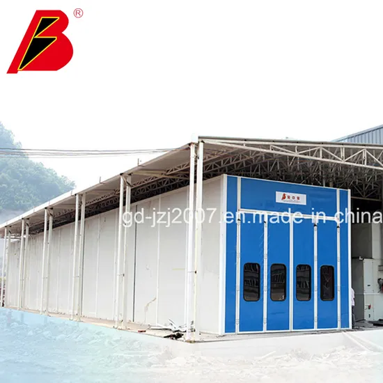 Bus Spray Booth Truck Painting Room Spray painting equipment Vehicle Spray Booth supplier We accept different kind of customied design paint booth. Paint Booth / Truck Bus Spray Booth (BZB12000) ( CE ) External Size (mm): (L) 12150 x (W) 7000 x (H) 5600 Internal Size (mm): (L) 12000 x (W) 5000 x (H) 4800 Main Door Size (mm): (W) 4000 x (H) 4800 Air Flow (m3 /h): 36000 x 2 Air Speed (m/s): 0.3-0.5 Operating Temperature (° C): 60 ~ 80 Power (kw): 41 Vehicle Suited: Truck and Bus Main features: 1. Wallboard: Sandwich style EPS (epispastics polystyrene) 75mm thickness. Colorful steel skin boards 0.476mm thickness. Galvanized steel roof panel. 2. Door: 4 PCS of front doors with special rigid frame. Size: 4000(w) x 4800(h). 2 PCS of emergency doors. 3. Air Intake System (2sets): Each set consists of 2x5.5kw intake fan. Total 4 units of 5.5kw intake fan. BELIMO 20N electric damper. 4. Air Exhaust System (2sets): Each set consists of 1x7.5kw exhaust fan. Total 2 units of 7.5kw exhaust fan. Multi-layer fiberglass filter. Exhaust air from basement or two sides of wallboard. 5. Heating System (2sets): Each set consists of 1 unit Italy Riello G20 diesel burner, 200000Kcal/h. Total 2 units of burners, 400000Kcal/h. The heat exchanger is made of 1.5mm thickness stainless steel which features more heat dissipating surface, better heat exchange and better burner efficiency. 6. Lighting System: Ceiling light has 16 units x 3 PCS of 40W lamps. Side light has 18 units x 2 PCS of 40W lamps. Total 84 PCS of 40W lamps. 900 Lux. 7. Air Purification: Dual filtering structure. The primary filter can capture granules larger than 10μ m. Ceiling filter capture granules bigger than 5μ m. The air cleanliness in the working environment can reaches 98%