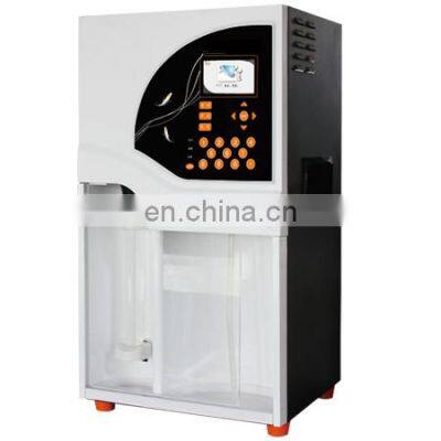 K9840 Automatic Kjeldahl Distillation Unit micro Protein Nitrogen Content Analysis Description K9840 Auto Distiller adopts globally accepted Kjeldahl nitrogen determination method to determine nitrogen content of sample. All intelligent software design makes the sample distillation complete within minutes. The distillation and condensation automatic cleaning system makes the measurement precision further improved.It is widely used in food processing, feed production, tobacco, livestock, soil fertility, environmental monitoring, medicine, agriculture, scientific research, teaching, quality control and other fields for the test of nitrogen or protein content, can also be used for the test of ammonium, volatile fatty acid/alkali, and so on.Characteristics:Display: 4.3" LCD screenManual/automatic mode fee changeoverAutomatic alkali liquid quantification and fillingAutomatic boric solution quantification and fillingAutomatic or manual filling mode is optional according to test needDistillation time can be set freely, and automatic alarming upon completionAutomatic cleaning of control system and distiller, ensuring high measurement accuracyPerfect safety protection system gives distiller and tubes measurement and protection against over-temperature and over-pressureIntelligent design of nitrogen tube peripheral facilities include safety designs and displacement hintIntelligent cooling water control system achieves cooling water control and testEmergency stop operation is able to deal with unexpected accidentsAutomatic fault detection and intelligent audible and visual alarm system are availableFeature:1.Adding solutions automatically: automatic adding NaOH solution, acid solution, distillation water.2.High efficiency with low cost: provide automatic function with economic solution.3.Energy saving: low power capacity, saving cost and energy.SpecificationTechnical data:Measuring range0.1mg ~240mg NRecovery≥99.5%Sample capacitysolid≤6g/sample, liquid≤16mL/sampleDistillation speed3-6min/sampleCooling water consumption1.5L/minOperating modeManual/automatic modeDisplay modes4.3" LCD screenPower supply220VAC±10%, 50HzPower1.3KWNet weight30KgDimensions400mm×385mm×735mm Please send inquiry>> If you need any detail packing information, please contact us>> If you have any question, please contact us>>