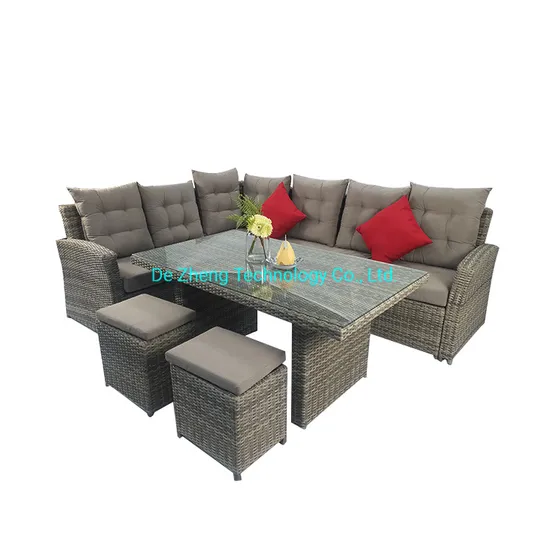 | Material | Dia 28x1.2mm aluminum tube frame stainless steel hex screw K/D armrest & K/D legs W8*1.2mm PE rattan 10cm thickness waterproof fabric sofa seat cushion 5cm thickness waterproof fabric ottoment seat cushion Pillows 5mm thickness tempered clear glass top 1 set = 1*Left 3 seat sofa+1*Right 3 seat sofa+ 1*Dining table+2*Ottoment |