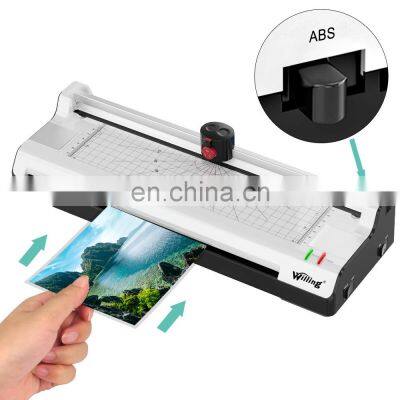Product DescriptionA4 Laminator Paper Trimmer Corner Rounder 3 in 1 Thermal Laminator Machine Thermal Laminator MachineProduct NameHome LaminatorModel NOOL381BrandWillingMachine MaterialABSBody ColourBlackFunction3 in 1 laminator with paper trimmer and round corner Paper SizeMax A3 sizePower365wTemperature105-138℃Roller2 rollersLamination speed250mm/minWarm up time3-5 minEntry width330 mmMax Lamination Thickness0.5 mmLamination speed400mm/min Pouch thickness80-125micProduct size420x145x95mmBatch order Lead time45days Color box size500*170*90mmCertificationGS CE EMC CB KC RCM+SAACarton size555*478*212mm,4pcs/cartonVolume/CTN0.056CBM N.W1.84 kg/pcSale serviceVideo support, online supportG.W10.12 kg/cartonPlace of ProductGuangdong,CN Feature Model OL3811.Laminator, corner rounder, rotary trimmer with straight, perforated and wave cutting styles.2.Hot & cold modes fulfill different needs, use self-adhesive pouches for cold laminating only. 3.Fast Laminating & Precise cutting set Jam release.4.Perfect tool to make diy craft.5.Accessory replacement and 1-year warranty.6.Overheating protection.7.ON/OFF,COLD/HOT,simple and practical.Related ProductsCompany InformationLong-term PartnerCompany PicturesCertificatesExhibition PicturesPackaging & ShippingFAQ