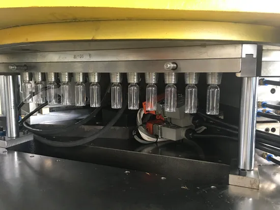 injection screw to inject preform; the plate rotates preforms to blow/stretch blow station with themselves heat, without any reheating for blowing, Then the product will rotate to release station and drop down, it is fully automatically cycle rotation working mode.