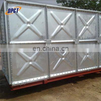 Galvanized steel water storage tank for manufacturing plantProduct DescriptionGalvanized Steel Combined Water Tank is punched by Q235A into 1220mm*1220mm or 1000mm*1000mm and 1000mm*500mm, 500mm*500mm standard panels, drilling around, after HDG treatment, assembly at site. When combined, the gap between two standard panels is sealed by silicon pad, connected by bolts.Product nameGalvanized steel water tankMaterial compositionQ235 steelProduct Size0.5*0.5m, 1*1m, 1*0.5m, etcPanel Thickness3mm,2.5mm,2mm,1.5mm, it is different according the size of the tank.Tank Volume1-1000m3Connection wayBoltedEco-FriendlyYesApplicationwater storageProcess techniqueMouldingWater capacity varies from 1.0 cubic meter to 1000 cubic meters, height may reach as great as 5 meters. Inflow, outflow tubes as well as return tube's diameter and place is decided by the designer, passages of at least 7000mm is needed around the tank.Raw material: Q235 steel;Panel size: 1x1m, 1x0.5m, 0.5x0.5m;Process technique: ramming craft;Connection way: arc argon welding;Panel thickness:3mm,2.5mm,2mm,1.5mm, it is different according the size of the tank.1. Easy handle and install,free volume design,no leakage,ideal mechanical structure and meet fire and building standard. 2. Anti-corrosion, anti-aging, no distorsion, no infiltration .3. Easy to clean and conveniently to install and assemble.4. It can storage not only hot water, but also cold water, and has a better shockproof and shock resistant ability.Bolt. nut & washers: stainless steel 304 material.Sealing material: Non-toxic P.V.C foam tape shall be used in between the jointsCovers:The tank cover shall be constructed from 1.2mm to 3.0mm of thickness stainless steel 304 material according to the requirementFlanges :The sectional panels shall be pressed to double flanges at the angles of 45 degree and 90 degree to the face of the plate on four sides.Reinforcement Method :All tanks are internally braced with angle stays to endure the rigidity of the tank when filled with the water. The Top panel is supported by top panel support, which shall be made of stainless steel grade 304 or 316 material according to requirement. Precautions1.When you order should provide water tank size, take over the place, diameter size.2.Water tank can be supporting supply.3.Use water injection temperature for the 4-65 is advisable. Water injection temperature higher than the value can be put forward in order to separately solve.4.Water tank inside and outside of the other welding not welding, prevent damage porcelain face.5.Water tank to the ground under should with structure design personnel for approval shall prevail.6.Water tank should be regularly cleaned, try to prevent water into the trash.ApplicationThis galvanized steel water tank is widely used in storage and regulation of living water supply & construction water supply, and temporary water storage tanks for expansion of the heating system, condensate tank and construction, geological survey, industry, National defense Water, chemical, and so on. Taking flexible, reasonable plate design, suitable for all capacities combined water tank. Suitable for living water with PH value: 6.5-8.5, using life: ≥ 20 yearsRelated ProductsCompany InformationHEBEI DONGDING CHEMICAL TRADE CO.,LTD is made up of several manufacturing enterprises, is a high tech enterprises that collection of sale for project consulting, designed and developed, engineering design, materials purchasing, transport of goods, equipment installation and training debugging, and has passed ISO 9001:2015 international quality management system certification, our company is the national foreign trade, the general administration of customs approved the company has import and export right.We mainly produce potassium sulfate production equipment,FRP tank production equipment,FRP pultruded products(include FRP Square tube/Rectangular tube /Round tube /Rod / U channel / I beam / Flat / Angle /Decking panel /Plum blossom tube /Ladder carling /Ladder crossgirder ),FRP pipe, FRP tank,FRP septic tank,FRP water tank,FRP grating,Cooling tower,FRP scrubber,Cable tray,FRP cover,FRP flange,FRP rock bolt,FRP handrail and so on,Looking forward to your visit and communication!Packing & Shiping>> Packing: According to the order.>> Delivery: Within 15 days after the payment was received.FAQ1. Q: Are you Trading Company or Manufacturing Factory? A: We are both manufacturer trading and company. We have our own factory for almost seven years, and we have better service of overseas customers. Welcome to send your inquiry! 2. Q: I am interested in your products, could I get sample for free? A: We can supply a few pieces FREE samples if we have some in stock, and you only need to pay the freight cost by yourself. Welcome to send your inquiry for FREE samples! 3. Q: How about the Delivery time? A: 10-15days after receiving the deposit based on the MOQ. Normally, 30-35days to finish the order for a 20ft container. Welcome to ask for the detailed delivery time according to your order quantity! 4. Q: How can you guarantee the product quality? A: We have the quality control system ISO9001:2015, and it's been followed strictly. We also have the professional QC team, and each our package worker will be in charge of the final inspection according to the QC instruction before packing. 5. Q: What is about the payment terms. A: Basically, the payment terms are T/T, L/C at sight. Western Union, Alipay. 6. Q: Can you do OEM for me? A: We accept all OEM orders,just contact us and give me your design,we will offer you a reasonable price ASAP.