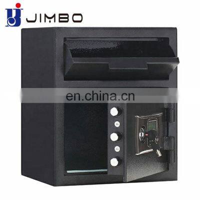 Products DescriptionDrop safe*Product NameJimbo home digital electronic keypad vault cash drop safe box*Brand NameJimbo*Product ModelDH Series*MateritalHigh quality cold rolled steel sheet Q235*Door Thickness10 mm*Body Thickness3 mm *LockElectronic Digital Lock*HandleBrushed solid steel handle*CertificateCE/ISO 1182/ROHS/FCC*Available colorWhite , Black , body and door can be in different colors*Packing5 layer standard export carton with thickened foam*SurfaceDurable electrostatic powder coating*Main productsFireproof safe, Bulglarproof safe, Home safe ,Vault door, Watch winder safe, Hotel safe box, Steel Lockers, Filing CabinetsRecommend ProductsCompany ProfileFoshan jimbosafe Co.,Ltd established in 2012, exporting our safe box to more than 118 Countries with over 10 years history . Located in Foshan,Guangdong, Jimbo owns 5,000m2 Modern Workshop, 50 Skilled workers,3 Reliable QC and 10 production machines and passed 4 certification (CE, ROHS, SGS, ISO). Through our experienced sales team, we finish 50,000,000.00+RMB turnover per year and keep growing.As Assessed Supplier by Alibaba, we hope can cooperate with you!Our TeamProduct packagingFAQProduction relatedIf you have any other questions, we would be more than happy to answer them for you. Please contact us below:Mrs. AnnEmail: annie@jimbosafe.com / Jessica@jimbosafe.com / sales01@jimbosafe.comMob & Wechat & WhatsAPP ::+861666567569Q: Do you provide samples?A: We can provide a sample with freight and handling charges at your expense.Q: How do you send your samples?A: We usually send via international couriers such as DHL, FedEx or UPS. We can also work with you if you have other alternative arrangements.Q: What is your lead time? A: Our production lead time is typically between 25 to 45 days from receiving payment, depending on chosen items, quantities and specific requirements. We can have off the shelf goods ready to be shipped in 5 to 10 days if there are available stock and no change request.Q: Is there any warranty offered for the product?A: A two-year Limited free-warranty is offered.Q: What are your payment terms?A: We can work with L/C or 30% deposit upon ordering and remaining balance prior to shipping of products. We can provide photos of finished goods and also accept on site final inspection.