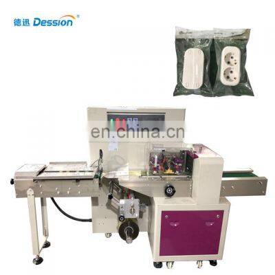 Full servo driven horizontal flowpack electric socket packing machine switch filling and packaging machineProduct DescriptionMachine and structureITEMDS-250XDS-350XDS-450XDS-600XFilm WidthMax.250mmMax.350mmMax.450mmMax.600mmBag LengthBag Width30~110mm50-160mm60-210mm60-280mmProduct HeightMax.40mmMax.70mmMax.45mmMax.70mmFilm Roll DiameterMax.320mmPacking Speed40~230 bags/min40~230 bags/min30-150 bags/min30-150 bags/minPower220V, 50/60HZ, 2.4KVAMachine SizeL)3920 * W)670 * H)1320mmL)4020 * W)720 * H)1450mmL)3990 * W)900 * H)1468mmL)3990 * W)1000 * H)1468mmMachine Weight800kg900kg900kg1050kgOptional DeviceDate Coder / Air-filling Device / Punching DeviceMachine PackingWooden BoxMain Features1.Efficient: Bag-making, filling, sealing, cutting, heating, date / lot number achieved in one time; 2.Intelligent: Packing speed and bag length can be set through the screen without part changes; 3.Profession: Independent temperature controller with heat balance enables different packing materials; Dual inverters controller, upgradable PLC system, self-failure diagnosis, double encoder. 4.Characteristic: Automatic stop function, with safe operation and saving the film; 5.Convenient: Low loss, labor saving, easy for operation and maintenance.6.Adapability: one set of machine can be applicated to different kind of product via optional devices, such as air-filling device, feeding line, etc.Detailed ImagesEasy Control Touch Screen Standard English and Chinese. Any language can be customized.Imported PLC microcomputer with interface and frequency control enables bag parameter setting more convenient and easier. SUS304# ConveyorThe whole conveyor is made of 304# stainless steel, qualified for food packaging.Film Roller & High Sensitivity The film can be replaced easily on the film roller.High sensitivity eye spot detector enables the film positioning more accurate and avoid wasting film or destroying product.Bag Former#304 stainless steel bag former is for shaping the film into a bag.Different bag width needs different bag former.Durable Sealing Cutting BladesHigh speed of fine and clean cutting and sealing bags.Positioned stop function avoides sticking blades and wasting materials.Send inquiry to usRelated ProductsPacking & DeliveryPayment1.T/T and Western Union are accepted2.30% deposit before production and 70% balance before shipment3.All banking charges outside China are on buyersShipping1.Upon receipt of payment , delivery date will be in 15-30 working days,2.By Air, by Sea or by Express (DHL etc)3.Shipment cost will depend on the destination, shipment way and the weight of the goodsCertificationsOur ServiceSales TeamAfter-sales teamOur CompanyFoshan Dession Packaging Machinery Co.,Ltd is located in nanhai district, foshan,It is a collection of research, production, sales and after-sales service as one of the production-oriented enterprises.Machines are widely used in food, articles for daily use, hardware industrial products, medical supplies, hotel one-time items, etc. Along with the continuous development of science and technology, the level of automatic packing machinel is higher, scope will be wider.large vertical workshoppillow machine workshopsmall vertical workshopCustomer PhotosFAQQ1:Do you have manual or operation video for us to know more about the machine? Yes, not only manual or operation video, 3D drawing also available to make as per your design,also the video we can make of testing the material from our packaging machine if your packing goods easier for us to find from our local market. Q2:How can I trust you for the first time business ?Please note our above business license and certificate. And if you don't trust us, then we can use Alibaba trade assurance service, guarantee your money, and guarantee your machine's on-time delivery and machine quality.Q3:Is engineer available to serve oversea?Yes, but the travel fee is paid by you. So actually to save your cost, we will send you a video of full details machine installation and assist you till the end.Q4:How can we make sure about the machine quality after we put the order?Before delivery, we will send you the pictures and videos for you to check the quality, and also you can arrange for quality checking by yourself or by your contacts in China.Q5:Will you provides the door to door service?Yes. Please offer us your final destination, we will check with our agent to see if it available, and most of the area is ok for us to clearing and sending in your countries.