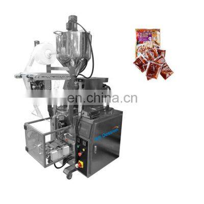 Product DescriptionDession liquid packing machine is suitable for the packaging of various liquid and sauces, such as soup,edible oil,liquid medicine,cream,seasoning sauce,honey,shampoo and shower gel etc.According to customer needs,the bag types can be changed:back seal, three sides seal, four side seal.1. The section where the material contact is stainless steel as the body of machine is optional for complete or partial stainless steel and all out equipments have passed the CE Standard.2. Optional English or other languages screen display, easy and simple operation. 3. High-sensitivity photoelectric color tracing and digital input of cutting position get more accuracy.4. Packaging speed and length of bags can be set to some extent without further adjustment and parts changing packaging speed and length of bags can be set to some extent without further adjustment and parts changing. 5. Bag-making, filling, sealing, cutting, counting can be achieved automatically and straightly. 6. Bag-making equipment can be changed according to specific requirement of customers and products.Model NO.DS-320YMeasuringLiquid Filling PumpBag ShapeBack Sealing / 3 Sides Sealing / 4 Sides SealingPacking Speed30~50 bags/minFilling Range50~500 mmBag Length40~200 mmBag Width50~150 mmMachine SizeL)640*W)700*H)1580mmEasy Control Touch ScreenLanguage: Standard English and Chinese. Any language can be customized.PLC: Imported PLC microcomputer with interface and frequency control enables bag parameter setting more convenient and easier. Film RollerThe film can be replaced easily on the film roller.Various films adaptable: OPP/CPP,OPP/CE,MST/PE/PET/PE.Pneumatic liquid pumpthe filling weight is adjusted,the texture of the machine is #304 stainless steel for the material contact parts.It is safe andmeets with the GMP standard.According to the viscosity of the filled liquid, you can choose to replace the mechanical pump.Bag Former#304 stainless steel bag former is for shaping the film into a bag.Different bag width needs different bag former.Bag Cutting DeviceHigh speed of fine and clean cutting and sealing bags.Positioned stop function avoides sticking blades and wasting materials.According to customer needs,the bag types can be changed:back seal, three sides seal, four side seal.According to your needs, you can choose to replace or add the following configuration. For example, 3 sides sealing device, 4 sides sealing device, linking bag device, gas-filled device, easy tearing device.According to the consistency of the filling material, add a heating and stirring device or use the mechanical pump.If you want to know more about the machine, please contact me!!!Related ProductsIf this machine can't meet your requirements, we have more products to recommend to you.Our CompanyCertificationsPacking & DeliveryPayment1.T/T and Western Union are accepted2.30% deposit before production and 70% balance before shipment3.All banking charges outside China are on buyersShipping1.Upon receipt of payment , delivery date will be in 15-30 working days,2.By Air, by Sea or by Express (DHL etc)3.Shipment cost will depend on the destination, shipment way and the weight of the goodsFAQQ1:Do you have manual or operation video for us to know more about the machine? Yes, not only manual or operation video, 3D drawing also available to make as per your design,also the video we can make of testing the material from our packaging machine if your packing goods easier for us to find from our local market. Q2:How can I trust you for the first time business ?Please note our above business license and certificate. And if you don't trust us, then we can use Alibaba trade assurance service, guarantee your money, and guarantee your machine's on-time delivery and machine quality.Q3:Is engineer available to serve oversea?Yes, but the travel fee is paid by you. So actually to save your cost, we will send you a video of full details machine installation and assist you till the end.Q4:How can we make sure about the machine quality after we put the order?Before delivery, we will send you the pictures and videos for you to check the quality, and also you can arrange for quality checking by yourself or by your contacts in China.Q5:Will you provides the door to door service?Yes. Please offer us your final destination, we will check with our agent to see if it available, and most of the area is ok for us to clearing and sending in your countries.Our Service