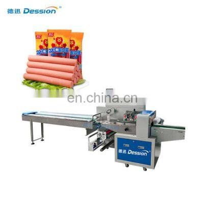 Big Bag Hot Dog Packing Machine High Speed Pouch Sausage Packaging Machinery Machine IntroductionPackaging ApplicationAutomatic flow packing machine is a widely used packing machine. Suitable for all kinds of product packaging. Including medicalsupplies, vegetables and meat, baked bread, snacks and candy, daily necessities, hardware accessories, etc.Packing EffectThe effect after packaging is back-seal bag. According to demand, other devices can be customized or upgraded to meet other models. For example, pillow bag with hole, bag with label, gusset bag, etc.Machine Structure and ParametersMachine Characteristics1. Double frequency conversion control, the bag length canbe set and cut, no need to adjust the air, one step in place, saving time and film.2. Man-machine interface, parameter setting is convenient and quick.3. Fault self-recognize function, fault display at a glance.4. High-sensitivity photoelectric eye color tracking, digital input sealing position, make sealing position more accurate.5. Temperature independent PID control, better suitable for various packaging materials.6. Positioning stop function, no sticky kuife, no waste film.7. The transmission system is simple, the work is more reliable, and maintenance is more convenient.8. All control is implemented by software, which is convenient for function adjustment and technical upgrade, and never lags behind.ModelDS-250XDS-350XDS-450XDS-600XDS-700XDS-800XFilm Width(mm)Max.250Max.350Max.450Max.600Max.700Max.800Bag Length(mm)45~33065~330120~450130~450120~600120~600Bag width(mm)30~11050~16060~21060~28050~33050~380Products Height(mm)Max.70Max.80Max.110Max.150Max.150Packing Speed(bag/min)40~23030~15030~15020~12030~150Machine Power220V / 380V, 50/60HZ,2.4KWMachine Size(L*W*H, mm)3920*670*13204020*720*14503900*900*14683990*1000*14684400*1100*14604400*1200*1460Machine Weight800KG900KG900KG1050KG1050KG1050KGDetails ImagesMachine WorkflowThis machine is easy to operate. Just set the parameters on the screen, and then you can start the machine. Put the product on the conveyor belt, the machine will automatically pull the film, the bag is formed, sealed, and finally the bag is cut.Multilingual touch screenThe machine supports various language customization, easy to operate.High sensitivity eye sensorThe eye sensor automatically senses the color code to ensure accurate and beautiful packaging effects.Replaceable bag formerWhen you want to change the bag width, you only need to change a different size bag fromer.Electronic control componentUse Panasonic PLC and frequency converter to ensure the stable operation of the machine.Related ProductsWhy Choose UsVR1. Professional and Strong TeamDession has a professional team that can provide customers with various packaging solutions. After fully understanding the customer's needs, we provide the most suitable packaging solution to the customer. Then start the production of the machine. We have a strong production and processing capacity, from the customized processing of accessories to the assembly and debugging ofthe machine. Finally, it is packaged and shipped, and it only takes a week to complete.2. Excellent transportation serviceAccording to the needs of customers, we can provide sea transportation, air transportation, and land transportation services, so that you can get the machine as soon as possible. Provide door-to-door transportation services.3. Timely and effective after-sales serviceChoosing us is not only buying a machine, but also our professional and timely service. 1. When the machine is delivered, we will attach a video of the installation and operation of the machine, so that you can use the machine quickly. 2. All electrical appliances of our machines have a one-year warranty, and we will replace them if they fail. 3. When your machine fails, we will have professional engineers to provide professional online after-sales service to help you solve the problem. 4. If the problem cannot be solved online, we will arrange an engineer to repair it on site within a week.Buyer FeedbackWe have 8 years of experience in foreign trade and export, and now our customers have spread to 90 countries all over the world. With our high-quality machines and professional services, we have won unanimous praise from our customers.Company Profile Dession a leading manufacturer of Packaging machine and supporting facilities, which has successfully developed more than 80 kinds of packaging machines. Dession Packaging Machine has widely applied for different fields throughout the world, such as food/ industrial food, medicines, hotel supplies, disposable goods, rubber goods, daily appliances, hardware fittings, sporting goods, toys etc. Dession has more than 8000 square meters of production plants, 5 production workshops and a parts processing workshop, including small vertical machine production workshops, vertical machine production workshops, pillow machine production workshops, cartoning machine production workshop and filling machine production workshop.FAQQ1:Do you have manual or operation video for us to know more about the machine? Yes, not only manual or operation video, 3D drawing also available to make as per your design,also the video we can make of testing the material from our packaging machine if your packing goods easier for us to find from our local market. Q2:How can I trust you for the first time business ?Please note our above business license and certificate. And if you don't trust us, then we can use Alibaba trade assurance service, guarantee your money, and guarantee your machine's on-time delivery and machine quality.Q3:Is engineer available to serve oversea?Yes, but the travel fee is paid by you. So actually to save your cost, we will send you a video of full details machine installation and assist you till the end.Q4:How can we make sure about the machine quality after we put the order?Before delivery, we will send you the pictures and videos for you to check the quality, and al