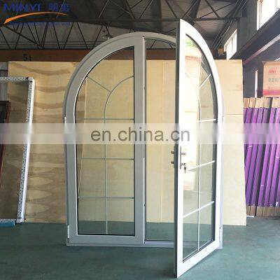 ItemSemi Circular Top Design Aluminum Entry Doors Front Door For SaleProfile1.6063-T5/T6 normal aluminum,thermal break aluminum2.pvc/upvc/VINYL(China top brand CONCH/German Brand REHAU/Korea brand LG)Glass1.Double tempered glazing:5mm+12A(Air)+5mm; 5mm+12A+5mm tinted; 5mm+12A+5mm Low-E; 5mm+27A+5mm 2.Single tempered glazing: 3/4/5/6/8/10/12/15/19/21mm3.Laminated glazing: 5mm+0.76+5mm, 5mm+0.38+5mmHardware1.German brand: Roto, Siegenia, Geze2.Chinese brand: Kinlong,HopoMesh1.Stainless steel security mesh2.Aluminium security mesh3.Fiberglass flyscreen4.Retractable flyscreenSurface treatment1.Powder coating2.Anodized3.Electrophoresis4.Wood grain5.Fluorine carbon coatingParametersDouble glass sliding windowsSounds insulation: RW ≥ 30 dBWind pressure resistance: 4500 paAir permeation resistance: 70/150Water resistance: 450mmN6 CLASS based on AS2047 STANDARDWarrantyTen yearsQ: Are you a Trading Company or a Factory? MINYE is 100% real factory and has been verified by SGS Group.Here is a VCR for your reference: https://shanghai-my.en.china.cn/company_profile/video_introdution.htmlQ: How about your production time? About have 25-30 working days.It depends on the windows&doors types and profile (like color requires).Q: What about your MOQ? For window and door, the minimum order quantity is 30 Square meters.Q: Do you accept customized design and size? Yes, sure, windows and doors are highly customized goods. So the size and design are up to you.Q: What’s your payment term?T/T, L/C, Trade assurance and PayPal are available.Q: What is your color available? MINYE Standard Colors have Black, White, Dark grey, Nature, and Coffee. Other RAL Colors are also available but it will spend more time and money. Q: What kinds of hardware mostly? China brand: HOPO, KIN LONG, PAGANI, YEAR, CHUANG Germany brand: ROTO, SIEGENIA Italy brand: SAVIO, GIESSEQ: What is profile available in your factory? Aluminum (Non-Thermal Break and Thermal Break), PVC(UPVC&VINYL), Aluminum Cladding wood.Q: Do you provide Sample? Sure, it is available. But we need charge for sample cost and freight fee.