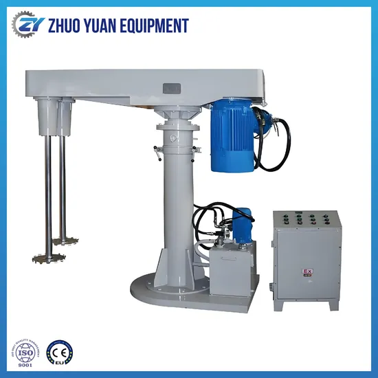 Very little air is absorbed during stirring and dispersing, and the mixing and blending effects are excellent. Using medium or high speed stirring and dispersion can make the materials dissolve quickly and the particles become smaller. Various specifications such as electromagnetic speed regulation, frequency conversion speed regulation and three-speed, stable and powerful operation, suitable for various viscosities. Hydraulic or pneumatic lifting, no leakage, free lifting and rotation, adaptable to various positions. Ordinary and explosion-proof configurations, safe and reliable, simple operation and maintenance, suitable for various materials. High-speed dispersion is aimed at dissolving, dispersing and evenly mixing products of different viscosities. Through the high-speed operation of the dispersion disk, strong shear impact and friction are generated between the material and the dispersion disk, so as to achieve the functions of rapid dispersion, dissolution, uniform mixing and emulsification.