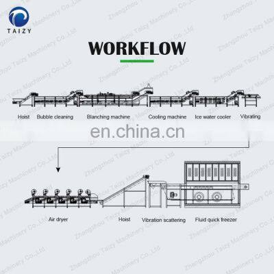 Frozen Green Peas Sweet Corn Production LineProduct Description The frozen fruits and vegetable processing line is for fresh vegetable and fruit production. It is suitable for different kinds of vegetables and fruits such as potatoes, tomatoes, carrots, peas, greens beans, leaf vegetables, pineapple, Mango, Cherry, peach, etc. And also line running well in customer's factory.Product FeaturesThe equipment has the characteristics of a high degree of automation, large output, low one-time investment, low energy consumption, small floor space, convenient operation and maintenance, excellent quality of finished products, and high profit. After bubble cleaning and high-pressure spray cleaning, the material is not easy to damage, and the cleaning rate is high.This bubble washing machine can clean all kinds of vegetables and fruits. The washing machine has a circulating water tank and high-pressure spray pipe, which can carry out bubble surfing cleaning and spray washing of the pepper, effectively removing the stains on the surface of the material, and will not cause damage to the pepper or chili. Quick-freezing the processed materials, the quick freezing machine can quickly freeze the vegetables and fruits, and other materials, the freezing speed is fast, and the freezing effect is good. An intelligent multifunctional temperature control system realizes precise temperature adjustment.Product ApplicationMachine display Packaging & ShippingWe can deliver the goods to you by sea, by air, by express or by land transportation. We will try my best to make you get the goods faster and safe. Company InformationZhengzhou Taizy Machinery Co. Ltd in Zhengzhou is a large scale industrial group mainly specialized in the food processing machines, covers Fryer Machinery, Fruits and vegetables processing Machine, Paste Processing Machinery, Meat Processing Machinery, Nut Processing Machinery. With years of manufacturing and sales experience in the machinery industry, let customer satisfaction is our ultimate aim, we got good fame for providing high-quality machines and best service concept - quality first, service foremost.Contact Us