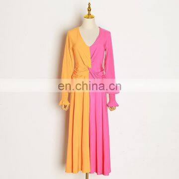 TWOTWINSTYLE Casual Patchwork Hit Colors V Neck Lantern Sleeve High Waist Dress Female