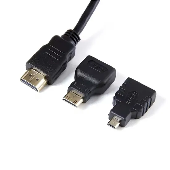 verview High Speed 1080P 3 in 1 HDMI Cable to HDMI / Mini HDMI / Micro HDMI Adaptor Kit Features:Watch video, stream media, and view documents through your TV A must have accessory for those who would like to watch videos and work on the big screen The cable gets the video signal out through HDMI standard output Gold plated pins and grounds connectionsSupport resolution: 480i, 480p, 720p, 1080i, 1080p Specification:color:blackConector A: Standard HDMI MaleConector B: Standard mini Male +Standard HDMI FemaleConector C: Standard micro Male +Standard HDMI FemaleProduct contents:1 x 1.5m HDMI to HDMI Cable1 x HDMI to Mini HDMI Adaptor1 x HDMI to Micro HDMI Adaptor Compatible with:HDMI: Apply with HDMI digital camera, tablet PC, PC Mini HDMI: Apply to N8, with mini HDMI digital camera, tablet pc, pc Micro HDMI: For LG G2X / P990 / P99 / MTO XT800 / XT720 / XT882 / MT810 / HTC EVO 4G / SHARP SH-07B /ACER A500 / W500 Note: Your TV must have HDMI for this cable to be compatible Service: 1. OEM service available and custom designs are welcomed 2. Available in different materials and assorted colors 3. We can manufacture all kinds of cable according to your design and sample 4. We can offer you premium quality, competitive, price, prompt delivery and low minimum orders |