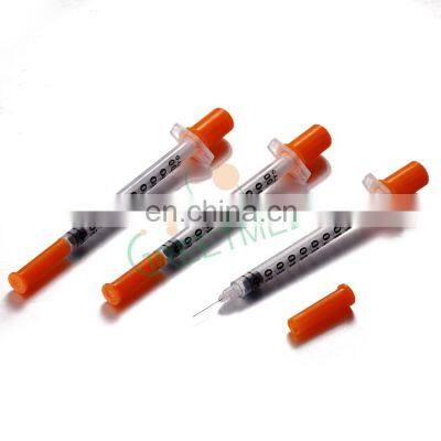 CE approved 100u colored 31g orange cap 0.5ml 1ml disposable insulin syringe with needleProduct DescriptionParameter Model GT037-300 Description 1. Insulin syringe with attached needle(29g,30G is available); Available with 0.5ml & 1ml 2. Based on extreme needle sharpness and smooth plunger movement, Insulin syringes are designed for maximum comfort. Clear, bold scale marking assure dosage control and accuracy. Packing 1pcs/PE bag or blister packing, 2000pcs/carton Color box size 195x100x25mm Export carton size 640x320x380cmRelated ProductsPackaging & Shipping Company InformationOUR ADVANTAGESExperience· More than 15 years experience in medical instruments industry· Products sell to more than one hundred countries all over the world· An esteemed & reliable manufacturer in chinaServices· One-stop shopping of medical instruments products· Less than 45 days delivery· 24 hours online service· We can provide our technical documents for your product registrationProfessionalism· Having a great understanding of market trends· Systematic product knowledge training system· Leading development oriented manufacturer· Help customers build factorySafety· All products certified by CE/ISO13485· Professional QC team Trade Shows Certifications FAQ1.Can I get some samples?We are honored to send you our samples,but the express fee need to paid by your esteemed company2.How about the delivery time?1).For Samply order will be prepared within 5 days.2).For bulk order.normally,it needs 20-30 days,it's based on you QTY.3.Can you do custom-made?OEM,ODM welcomed.1).Silk print your logo on the product.2).Customized colorbox.3).Design and produce based on your idea and draft.4.How about the payment?1).Amount less than $1000.You can pay for the order by Paypal,western Union.2).Amount more than $1000.You can pay for the order by T/T,LC.We support Trade Assurance - A free service that protects your orders from payment to delivery,it can make your funds safer.5.How about the shipping?1).For sample order,it can sent by express company like UPS,Fedex,TNT ect.We have strong cooperation with them and if you have express collected account,you will no need to pay us.2).For bulk order,it would sent by sea.We have our cooperation forwarder and you also can use your OWN forwarder.6.How about your service?1).Any Inquiries will be replied within 24 hours.2).Professional manufacturer,quality issue,competitive price.3).All products will be strictly quality checked and well-packed before shipping.4).If you order FCL and the broken more than 2%,we will replace you at the next time.5).We can assist you to apply the relevant certificates