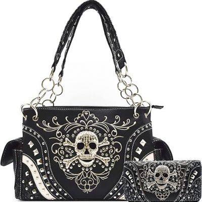 Punk Gothic Rock Metallic Skull Leather Purse Shoulder Bag Wallet Set