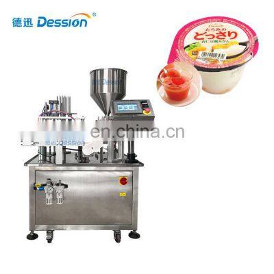 Rotary Cup Filling Sealing Machine Cup Jelly Water Filling MachineProducts DescriptionRelated Accessories :Note: Co-branding is available-customize your own lid and package with your logo to promote our brandWorking Processcup dropping devicefilling deviceFoil sealing deviceColorful Touch ScreenHopper and liquid pumpSampleTechnical DatasDS-900ADS-900BPacking speed400-600 cups/hour (output 1 cup)800-1200 cups/hour (output 2 cups)Machine size(L*W*H)1200*1500*1700mm1300*1600*1700mmPower1.2KW1.6KWAir pressure0.5-0.7MPaMachine Weight350KG400KGWhy Choose UsDession is a modern packaging equipment solustion provider integrating R&D, production and sales.Since the establishment of the company, with the continuous exploration, research and application of advanced technology, the company's development has begunscale, with an innovative team of professional and technical personnel, engineers, sales and after-sales service personnel.Dession has a professional team to provide customers with various packaging solutions. Fully understanding the needs of customers,engineers design the most suitable solution. We have our own processing and assembly workshop and quality inspection and debugging process to ensure the quality of the machine. After acceptance by the customer, they are packed in international standard wooden cases and shipped. Recommend ProductsFAQQ1:Do you have manual or operation video for us to know more about the machine? Yes, not only manual or operation video, 3D drawing also available to make as per your design,also the video we can make of testing the material from our packaging machine if your packing goods easier for us to find from our local market. Q2:How can I trust you for the first time business ?Please note our above business license and certificate. And if you don't trust us, then we can use Alibaba trade assurance service, guarantee your money, and guarantee your machine's on-time delivery and machine quality.Q3:Is engineer available to serve oversea?Yes, but the travel fee is paid by you. So actually to save your cost, we will send you a video of full details machine installation and assist you till the end.Q4:How can we make sure about the machine quality after we put the order?Before delivery, we will send you the pictures and videos for you to check the quality, and also you can arrange for quality checking by yourself or by your contacts in China.Q5:Will you provides the door to door service?Yes. Please offer us your final destination, we will check with our agent to see if it available, and most of the area is ok for us to clearing and sending in your countries.