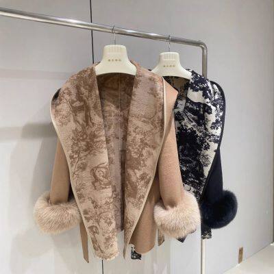 European double-sided wool coat tied mid-length coat hooded print fashionable loose temperament autumn and winter new style