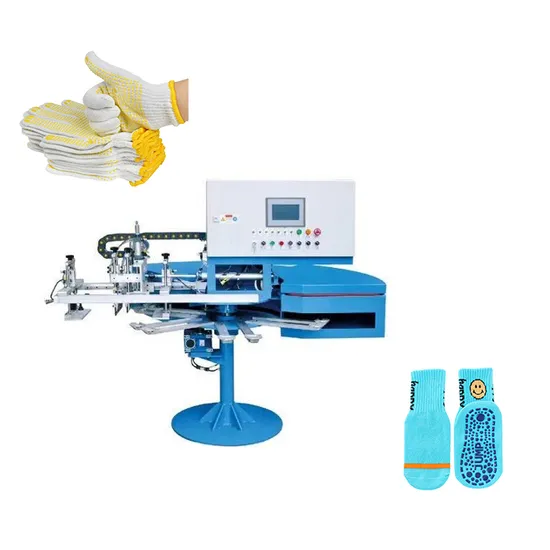 The main function of dotting machine is to print silk screen printing materials such as PVC or silica gel on knitwear (socks, gloves, scarves,etc.). Add anti-slip, decorative, and printed company or brand logos to the product.