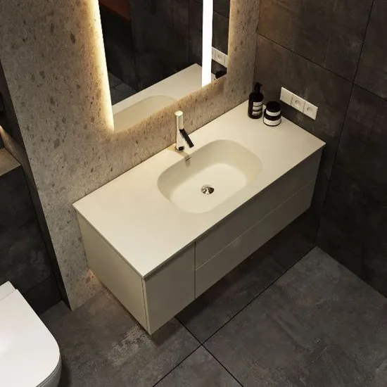 Bathroom vanities and sinks made with HONDAO solid surface combine beauty, functionality, durability, and stain resistance