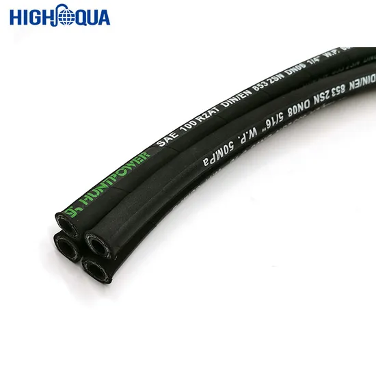 | Process feature: 1.Inner tube: Nitrile. 2.Reinforcement: Two braids of high-tensile steel wire. 3.Cover compound: Neoprene. 4.Temperature range: -40° F 212° F; -40oC~121oC. 5.Color available: Black, grey, blue, yellow, red, etc. 6.Application: High-pressure hydraulic oil lines used in construction, machine tool and agricultural applications using petroleum or water-based hydraulic fluids. |