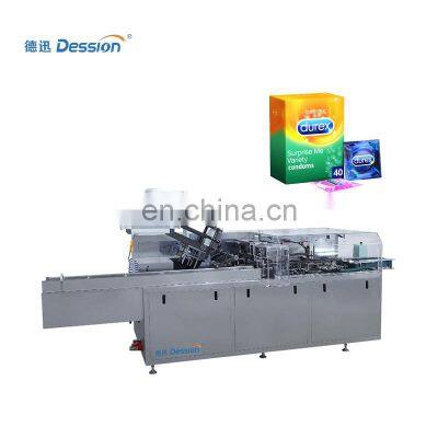 High Accuracy Condom Bag Sachet Cartoning Box Packing Machine Condom Packing MachineDession engaged in exported various filling and packing machine all over the world. Our machine widely applied for various kinds of regular objects like food, medicine, daily appliances,cosmetic,metals, industrial parts, boxes, trays, toys and etc.Box HolderBox Opening DeviceBox Sealing DeviceTouch ScreenModelDS-100APackaging Speed30-80boxes /minBox Quality Requirement250-350g/ m2 (according to customers' request)Box Dimension Range(65-200)mm* (30-90)mm* (15-60)mm (can be customized)Working pressure>=0.6mpaPower380V 50HZAir Consumption20m3/hMachine Size(L)3800*(W)1100*(H)1900mm1.Efficient: Box-filling, sealing, heating, date / lot number achieved in one time.2.Intelligent: Packing speed can be set through the screen without part changes.3.Profession: Dual inverters controller, upgradable PLC system, self-failure diagnosis, double encoder. 4.Characteristic: Automatic electronic eye detect to avoid empty box.5.Convenient: Low loss, labor saving, easy for operation and maintenance.6.Adapability: one set of machine can be applicated to different kind of product.Payment1.T/T and Western Union are accepted2.30% deposit before production and 70% balance before shipment3.All banking charges outside China are on buyersShipping1.Upon receipt of payment , delivery date will be in 15-30 working days,2.By Air, by Sea or by Express (DHL etc)3.Shipment cost will depend on the destination, shipment way and the weight of the goods