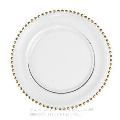 Factory Wholesale 13" Gold Rimmed Transparent Clear Beaded Glass Charger Plates For Wedding