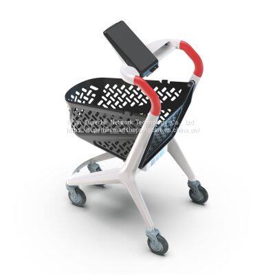 The Superhii S600 model smart shopping cart is designed to improve the traditional supermarket shopping experience and to ahieve digital full-course companionship .Customers log in to use it through face recognition and scan the items' bar codes while shopping .The cart can automatically push ready-to-use coupons in the shopping process ,and its positioning function makes it easy for customers to find items ,who can swipe their faces to directly pay for the selected items without queuing up ,thus realizing easy shopping .Besides ,based on people's habites in different regions ,every detail of the cart has been meticulously adjusted ,such as its capacity ,the elevation angle of the tablet computer , and the angle between the handle and the ground ,etc .