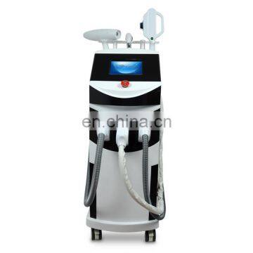 Salon popular!the best beauty multifunction machine e-light ipl rf+nd yag laser multifunction machine Treatment Applications 1.E-light/permanent hair removal,pigmentations treatment(Spots removal,smallpox removal,freckle removal),Skin rejuvenation(tighten skin,fine wrinkles removal,whiten skin),Acne Treatment,Vascular Therapy 2.Unipolar RF/wrinkles removal,tighten skin,lift skin,rebuild face outlines and body contours,contract large pores 3.Nd:YAG laser/all colors of tattoo removal,spots removal(freckle,coffee spots,age spots,nevus of Ota),embroidery lipline,eyeline,eyebrow pigments removal. E Light Handle Laser Handle RF Handle Our beauty salon equipments Advantage 1.Multi-purpose,functional complementary,widely application,marvelous treatment effect 2.8.0 inch big Color Touch LCD screen,humanized menu, easy operation 3.The shell is made of the ABS environmental material and beautiful design.. 4. The cooling temperature -2~0 °C,treatment more comfortable and safe 5. Water level, water flow and water automatic detection greatly increasing machine’s life; expectancy and safety; 6. Long continuous work time, stable function, shot period of treatment 7. 6 Multilingual languages,anywhere in the world can be easily grasped. 8.With two operation molde,easy mode for new user,professional mode. Technical parameter: E-light:IPL+Bipolar RF+ Water cycle refrigerationEnergy density:10-50J/cm2 (IPL) 10-50J/m2 (RF)Elight Spot size:15*50mm2E light power:2800WDischarge Interval:1s,2s,3s,4s(variable)E light Probe Tempreture:-2°C~0°CPulse Number:1-10 1-200mspulse width:1-200msPulse space:1-600msWavelength:640/530/480(Standard), 480-1200nm(Option)RF handle size:Diameter of handpiece : 43mm/30mm//15mmRF Frequency:10MhzRF power:1-20J/cm3RF delay:50-2500msRF Probe Tempreture:-2°C~0°CLaser Power:Q switch nd yag laser 500000shotsFrequency:1-10HZEnergy:1-1200MJLaser:1064nm,532nm,BDLSWater Alarm:YesTemperature Alarm:YesKinds Of Screen:LCD digital touch screen 8.0inchCooling system:semiconductor+ intelligent cooling + water+ wind + gelVoltage:110V-130V ,60HZ/ 220V-240V,50 HZSize Of Machine:50cm*53cm*118cmWeight Of Machine:40kg Treatment picture Product PicturesPacking and transport Certificates Purchase process Warranty& training 1 years warranty time for free, ex factory under normal and proper operation;free labor and material but without consumables parts.There is a professional international after-sale service team, who can provide you24 hours after-sale service and technical supports . Our machines are designed byModularization. Any problem, we will make sure where is the problem by yourdescription, photos or videos, and give you the solutions immediately . If there isany problem can not be resolved easily, we will send you the new module forchanging for free in two year, just the person knows some electrics knowledge canwork this . We will made warranty contract with you and take the two yearswarranty promise seriously .There is a copy user’s manuals for detailed instructions on the introduction, theoperation, the maintenance, etc.