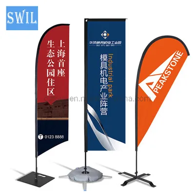 Beach Flag Beach Flags are the ideal advertising solution for outdoor/indoor events . It is lightweight , portable and easy to install . Flags in 65 or 110gsm polyester with print on 1 (mirrored) side or 2 sides. Our Feather Flag Kits include the printed flag, the pole set & the Stake Base,You can choose among different bases, eg. crossed, foldable, waterbags, spikes etc.