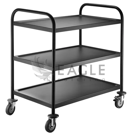 3 TiersStainless Steel Restaurant Service Trolley with black painting: 1.Made of stainless steel with chrome steel shelves.Surface treatment powder. 2. Fitted with 2 shelves and sound insulation material underneath. 3. Maximum load per tray 75 kg. 4. Includes 4 castors, of which 2 with brakes, fitted with corner protection. 5.All welding