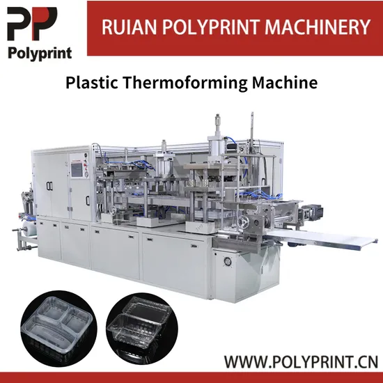 2.This machine is a multi-station automatic machine, which solve the problems of food packaging hygiene standards. It not only solves a lot of problems effectively in the production of PP, PS, PET, PVC and PLA plastic products, such as large capital investment, large labor input, complicated production process, lower hygienic security, etc, but also has extensive usage.