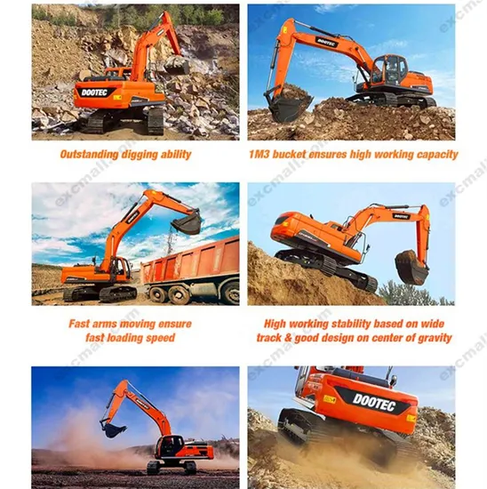 | Made In China New Doosan Similar Mining Excavator 23 Tons 1. Dootec excavator has strong power, high stability, 6-cylinder branded engine. 2. The hydraulic system is purchased from a well-known brand, using Euro III engine, which has low fuel consumption and strong power. 3. The upgraded hydraulic system has better flexibility, low oil temperature and high working efficiency. |