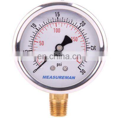 Product Description This liquid filled pressure gauge is designed for media which is not corrosive to brass, also where vibration and pulsation is a concern. * Pressure range: 0-100psi/kpa dual scale * For pressure measuring of gas, liquid which is not corrosive to brass, also where vibration and pulsation is a concern. * 2-1/2" dial size, 1/4"NPT lower mount * Stainless steel case, brass wetted parts, glycerin filled * Accuracy: +/-3-2-3%SpecificationCompany Profile Jindong Hydraulic is National High-Tech Enterprise and the fixed enterprise of hydraulic basic parts of National Electrical and Mechanical Department, our company established in 2004. we are professional manufacturer and exporter that is concerned with the design, development and production of hydraulic parts. Specially for hydraulic and pneumatic quick couplings and hydraulic valves, hydraulic hose and fitting adaptor. We are located in private industrial park of Jianhu County, Jiangsu Province, China, with convenient transportation access.We have our own design and R&D team for 16 years. We can tailor products to the requirement of our customers worldwide. We have a full range of perfect from raw materials to the finished product quality testing system. Our products fit the standard of ISO7241-1A, ISO7241-1B, ISO5675, ISO16028. Also, our products can interchange with brand PARKER, FASTER, HANSEN, TEMA, CEJN, NITTO, HOLMBURY, STAUBLI. We have passed ISO9001-2016 certification. All of our products have the CE and TUV certificates.Our company regard ‘Customer satisfaction, our pursuit’ as our tenet. If you are interested in any of our products or would like to discuss a custom order, please feel free to contact us. We are looking forward to forming successful business relationships with new clients around the world in the near future.Packing & DeliveryWhy Choose UsRelated ProductsExhibitionContact US