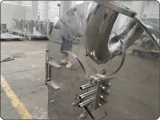 * It can be designed and manufactured according to GMP specification. Working principle The pusher centrifuge is a fully automatic continuous filter centrifuge. The solid/liquid mixture to be separated is continuously conveyed to the high-speed rotating feed distributor of the centrifuge through a conveying pipe or a screw conveyor of the centrifuge to be evenly distributed on the screen of the first-stage drum. The liquid to be separated rapidly passes through the screen of the centrifuge under strong centrifugal force and is discharged into the liquid collecting hood; the solid phase is trapped on the surface of the screen by the screen to form a solid filter cake. The two-stage push-type centrifuge drum rotates at a high speed, and the first-stage drum also performs axial reciprocation under the action of the hydraulic piston through the push rod; thus, the ring-shaped solid filter cake is pressed according to the piston. The length of the stroke is pushed to the second stage drum through the first stage,drum; after the filter cake of the second stage drum is further dehydrated, it is pushed to the solid collection tank of the casing to discharge the centrifuge.