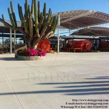 ---The Introduction of DOING waste tyre recycling to fuel oil pyrolysis plant---Waste tyre recycling to fuel oil pyrolysis plant can turn waste tyre to fuel oil with latest pyrolysis technology. Pyrolysis is the thermal decomposition of materials in the absence of oxygen. In the case of the pyrolysis of rubber tyres, the rubber degrades under high temperatures and long-chain hydrocarbons in rubber are broken down into compounds with shorter carbon chains in the reactor, yielding oil, gas and carbon black.