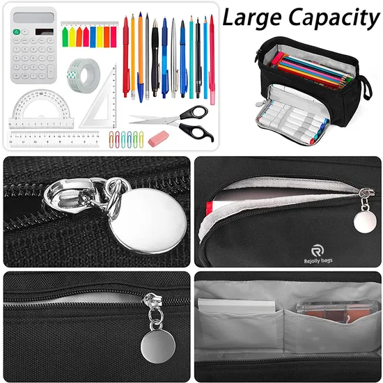 1. Large Capacity - This pencil pouch measures approx 10.5 x 6 x 4 inch and has a very large internal storage space; The main compartment can hold up to 100 pens or pencils, and can also store scissors, rules, sticky notes, index tabs, erasers, tape, rulers, staplers or small calculators.