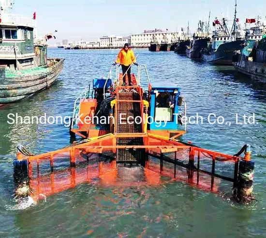 Kehan aquatic weed harvesters (or water weed harvesters, or aquatic trash skimmers) are usually used in river, lake, reservoir and coasts for cutting, collecting, storing and transporting waterweeds and floating garbage. The harvester can not only cut and collect all kinds of aquatic weeds, reeds, water hyacinth, but also collecting garbage, leaves and other waste in water. All of the equipment can work automatically and can save much labor force for its high efficiency. It is driven by hydraulic system and operated by one person, with the characteristic of simple structure, flexible movement and easy operation, which makes it an important environment friendly machine in water cleaning.