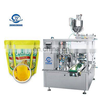 Product Description Model No.ZC-Y250Product Nameautomatic custom liquid food drink pouch with mini spout pouch packing machineryFunction Bag-feeding, Filling, Wrapping, Sealing Voltage380V 50/60hzPacking Speed 16-60 bags /minsPacking Bag SizeL: 100-350mmW : 60-250mmDimension (L*W*H)4000*2000*2100mmStation8 working stations Gross Weight 1800KGAir Compressed air consemed≤0.6m³ / minAccuracy ±1g (≤100g) / ± 1%( >100g) according to materialApplication Suitable for liquid or semifluid products packing, such as beverages, juice, ketchup, bechamel etc.Working Procedure1.Bag feeding2.Coding 3.Opening 4.Filling A5.Filling B6.Heat sealing A7.Heat sealing B8.Forming and output