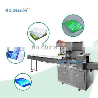 Dession Horizontal Pillow plastic fittings packaging machine widely applied for various kinds of regular objects like food, medicine, daily appliances,cosmetic,metals, industrial parts, boxes, trays, toys and etc.a4 Paper Packing MachineProducts Description1.Efficient: Bag-making, filling, sealing, cutting, heating, date / lot number achieved in one time.2.Intelligent: Packing speed and bag length can be set through the screen without part changes.3.Profession: Independent temperature controller with heat balance enables different packing materials; Dual inverters controller, upgradable PLC system, self-failure diagnosis, double encoder. 4.Characteristic: Automatic stop function, with safe operation and saving the film.5.Convenient: Low loss, labor saving, easy for operation and maintenance.6.Adapability: one set of machine can be applicated to different kind of product via optional devices, such as air-filling device, feeding line, etc.ModelDS-250BPackaging Speed40~230 bags/minBag Width30~110 mmBag Length 65~190mm120~280mm 90~220mm150~330mmFilm Roll WidthMax.250mmPower220V, 50/60HZ, 2.2KVAOptional DeviceDate Coder / Air-filling Device / Punching DeviceMachine Size(L)3770*(W)670*(H)1450mmEasy Control Touch ScreenLanguage: Standard English and Chinese. Any language can be customized.PLC: Imported PLC microcomputer with interface and frequency control enables bag parameter setting more convenient and easier. SUS304# ConveyorThe whole conveyor is made of 304# stainless steel, qualified for food packaging.Film Roller & High Sensitivity Sensor/ DetectorThe film can be replaced easily on the film roller.Various films adaptable: OPP/CPP,OPP/CE,MST/PE/PET/PE.High sensitivity eye spot detector enables the film positioning more accurate and avoid wasting film or destroying product.Bag Former#304 stainless steel bag former is for shaping the film into a bag.Different bag width needs different bag former.Durable Sealing Cutting BladesHigh speed of fine and clean cutting and sealing bags.Positioned stop function avoides sticking blades and wasting materials.According to customer needs,the bag types can be changed:back seal,stand-up bag and linking bag.If you want to know more about the machine, please contact me!!!Recommend ProductsOur CompanyCertificationsPacking & DeliveryPayment1.T/T and Western Union are accepted2.30% deposit before production and 70% balance before shipment3.All banking charges outside China are on buyersShipping1.Upon receipt of payment , delivery date will be in 15-30 working days,2.By Air, by Sea or by Express (DHL etc)3.Shipment cost will depend on the destination, shipment way and the weight of the goodsFAQQ1:Do you have manual or operation video for us to know more about the machine? Yes, not only manual or operation video, 3D drawing also available to make as per your design,also the video we can make of testing the material from our packaging machine if your packing goods easier for us to find from our local market. Q2:How can I trust you for the first time business ?Please note our above business license and certificate. And if you don't trust us, then we can use Alibaba trade assurance service, guarantee your money, and guarantee your machine's on-time delivery and machine quality.Q3:Is engineer available to serve oversea?Yes, but the travel fee is paid by you. So actually to save your cost, we will send you a video of full details machine installation and assist you till the end.Q4:How can we make sure about the machine quality after we put the order?Before delivery, we will send you the pictures and videos for you to check the quality, and also you can arrange for quality checking by yourself or by your contacts in China.Q5:Will you provides the door to door service?Yes. Please offer us your final destination, we will check with our agent to see if it available, and most of the area is ok for us to clearing and sending in your countries.Why Choose Us