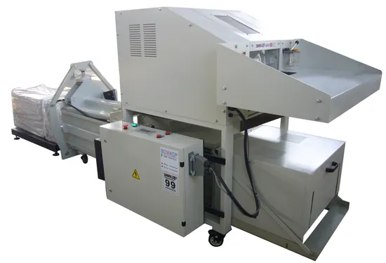 Industrial shredder for paper, staples, paper clips, credit/store cards, CDs/DVDs, floppy disks, and USB sticks.