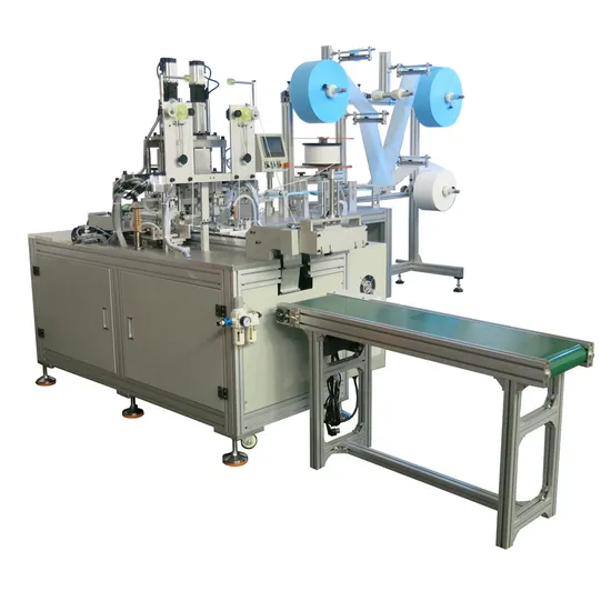 This 1+1(one mask body machine and one high speed ear loop welding machine) fully automatic 3 PLY face mask making machine is mainly composed of raw material conveying, nose bridge conveying, mask sheet folding and shaping, pattern welding and slicing around the mask sheet, automatic feeding to the ear loop welding unit, four-points welding ear loop welding unit , and finished product discharge. The entire mask machine is automated from the raw materials to finished masks, the whole process is controlled by PLC, and the operation is simple and convenient.