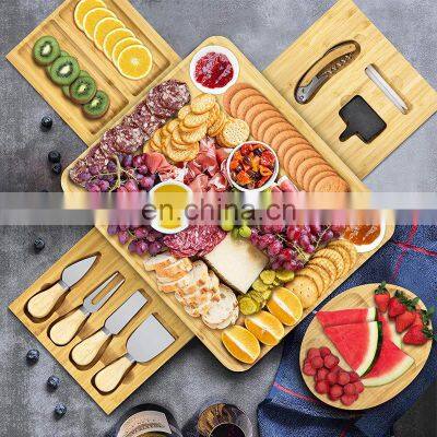 Product ParamentersProducts DescriptionNameBamboo Wood Slate Serving Tray Cheese Platter Knife Set Extra Large Charcuterie Cheese BoardColorBambooMaterial100% Natural BambooSize40 cm * 33 cm * 6 cmPackingBrown box and shrinkPortXiaMen,FuZhouPaymentL/C,T/T, trade assurance,Western UnionDescription1.Made of durable natural bamboo known to be environmentally friendly, stronger and more beautiful than regular wood.2.Ideal for serving breakfast, dinner, wine, or just anything else, or use for an elegant decoration display.3.This product comes with four drawers, cutlery and porcelain bowl.Functional diversity, with more storage space.4.Hand wash with mild soap warm water, for extended life of tray use bamboo oil occasionally.Pelative ProductsFactory introductionProduct packagingFAQ