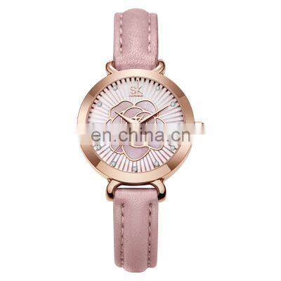 SHENGKE SK New Ladies Watch Rose Flower Dial Quality Leather Band Quartz Watches Custom Logo Watch Wholesale OEM K0148L Model Number K0148LBrand SHENGKE (SK)Style Luxury Women's WatchMovementJapan Quartz (2035)Case Material AlloyDiameter /Thickness26.5MM/6.5MMBand MaterialSteel BandBand Width10.0MMWaterproof3 ATMBattery Life20 Months 1. What's your MOQ? Can I mix styles and colors?A: Take our brand logo watches for wholesale is no MOQ limited , but if customized your logo (OEM ), the MOQ is :Alloy case watch 300pcs/style,can mix 2~3 colors ,stainless steel case watch 500pcs/per style .can mix 3~5 colors 2. Can we print our own logo?A: Yes,we can print your logo or design on the band, dial, buckle, back, case and other place, usually the color of the logo is one color.3.What about the warranty?A: 12 months movement warranty, and we are very confident with our products, and we will pack it very well, so usually you will receive your goods in good condition. But to avoid any subsequent trouble regarding quality issue, we suggest you check the watches once you receive them, and let us know if there is any damaged ones, so that we can deal with it accordingly.4.Do you offer Drop shipping (Blind shipping )?Yes , we offer Drop shipping/Blind shipping,we haven enough experience in drop shipping ,every day we have many watches to send out many countries for drop shipping.5. Do you do custom watch boxes?Yes, we do custom watch boxes. We can follow your requirement to make the boxes ,or you can select our boxes with your logo.6. What movement do you usually use in your watches?We usually use Japanese movement ,Swiss movement, and Chinese movement, for example Seiko,Citizen,Miyota,Ronda ,Kingstar we use most.7.What is your packaging?1.Not over 5 pcs order ,each watch will be put into a bubble bag then packaging well into a safe white bag(as below picture)2.Over 20 pcs order ,each watch will be put into a opp bag, then put into a bubble bag, after that all total put into a white box.(as below picture)For OEM/ ODM Products packaging:Normal packaging 1.Each piece will be put into a poly bag;2.20 pieces into a white box;3.10 white boxes into a 39*30*33cm carton; Special packaging: As per your request. **Note: Only Normal packaging service is free.