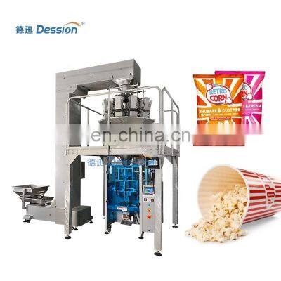 Automatic 500g Popcorn Packaging Machine Popcorn Snack Packing MachineMachine IntroductionPackaging ApplicationThis machine is suitable for packing of bulk materials with high precision and fragility.Such as puffed food, casserole, candy, potato chips, nuts, frozen food, pet food, small hardware, medicinal materials, etc.Packing EffectThis machine can provide back-seal packing.It can be upgraded to add the bag with hanging holes, bag with easy tear, gusseted bag and quad sealed bag effect according to the needsMachine Structure and ParametersModelDS-320AZDS-420AZDS-520AZDS-620AZDS-720AZFilm WidthMax.320mmMax.420mmMax.520mmMax.620mmMax.720mmFilling range150~800ml150~1500ml150~2000ml150~4000ml150~400mlBag sizeL:80~240mmW:50~150mmL:80~300mmW:60~200mmL:80~350mmW:80~250mmL:150~350mmW:200~350mmL:100~450mmW:100~350mmPacking speed5~70bags/min5~60bags/min10~50bags/min5~50bags/min10~40bags/minOptional deviceAngle of plug-in device, Linking bags device, Gas-filling device, Punching deviceMachine Characteristic1)Imported PLC full computer control system, color touch screen, easy to operate, intuitive and efficient.2)Impoted servo film transport system, imported color code sensor, accurate positioning, excellent overall performance and beautiful packaging.3)A variety of automatic alarm protection functions to minimize losser.4)Flat cutting, pattern cutting, linking cutting can be realized by changing the tools;easy operation with smooth bags.5)Bag-making equipment can be changed according to specific requirement of customers and products.6)Optional English or other languages screen display, easy and simple operation. Both packaging speed and bag length can be set with one click.7)All machines have CE certification and ROSH certificate.Details ImagesMachine WorkflowThis machine is easy to operate. Just set the parameters on the screen, and then you can start the machine. Put the product in the hopper, the machine will automatically pull the film, the bag is formed, sealed, and finally the bag is cut.Easy Control Touch ScreenLanguage: Standard English and Chinese. Any language can be customized.PLC: Imported PLC microcomputer with interface and frequency control enables bag parameter setting more convenient and easier.Automatic Electronic WeighterHigh precision sensor, Making high accuracy measuring; With excellent compatibility and easy using with other parts of packingequipment. Bag Former#304 stainless steel bag former is for shaping the film into a bag.Different bag width needs different bag former.Sealing and Cutting DeviceThe wheels will pull the film to this cutting device, which will create the top and bottom of the bags.Related ProductsWhy Choose UsVR1. Professional and Strong TeamDession has a professional team that can provide customers with various packaging solutions. After fully understanding the customer's needs, we provide the most suitable packaging solution to the customer. Then start the production of the machine. We have a strong production and processing capacity, from the customized processing of accessories to the assembly and debugging ofthe machine. Finally, it is packaged and shipped, and it only takes a week to complete.2. Excellent transportation serviceAccording to the needs of customers, we can provide sea transportation, air transportation, and land transportation services, so that you can get the machine as soon as possible. Provide door-to-door transportation services.3. Timely and effective after-sales serviceChoosing us is not only buying a machine, but also our professional and timely service. 1. When the machine is delivered, we will attach a video of the installation and operation of the machine, so that you can use the machine quickly. 2. All electrical appliances of our machines have a one-year warranty, and we will replace them if they fail. 3. When your machine fails, we will have professional engineers to provide professional online after-sales service to help you solve the problem. 4. If the problem cannot be solved online, we will arrange an engineer to repair it on site within a week.Buyer FeedbackWe have 8 years of experience in foreign trade and export, and now our customers have spread to 90 countries all over the world. With our high-quality machines and professional services, we have won unanimous praise from our customers.Company ProfileDession a leading manufacturer of Packaging machine and supporting facilities, which has successfully developed more than 80 kinds of packaging machines. Dession Packaging Machine has widely applied for different fields throughout the world, such as food/ industrial food, medicines, hotel supplies, disposable goods, rubber goods, daily appliances, hardware fittings, sporting goods, toys etc. Dession has more than 8000 square meters of production plants, 5 production workshops and a parts processing workshop, including small vertical machine production workshops, vertical machine production workshops, pillow machine production workshops, cartoning machine production workshop and filling machine production workshop.FAQQ1:Do you have manual or operation video for us to know more about the machine? Yes, not only manual or operation video, 3D drawing also available to make as per your design,also the video we can make of testing the material from our packaging machine if your packing goods easier for us to find from our local market. Q2:How can I trust you for the first time business ?Please note our above business license and certificate. And if you don't trust us, then we can use Alibaba trade assurance service, guarantee your money, and guarantee your machine's on-time delivery and machine quality.Q3:Is engineer available to serve oversea?Yes, but the travel fee is paid by you. So actually to save your cost, we will send you a video of full details machine installation and assist you till the end.Q4:How can we make sure about the machine quality after we put the order?Before delivery, we will send you the pictures and vi