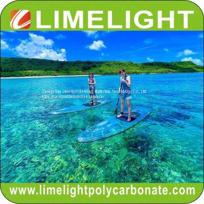 LIMELIGHT clear SUP Paddle board is assembled with 1 PC full transparent board, 1 PC stand up paddle, 1 PC rubber mat, 1 PC foot leash, 1 PC fin and 1 PC edge protector, etc. the paddle board is made of 100% virgin material from LEXAN Sabic material, it offers 100% full transparent window to help you discovering a new world under your feet. the quality rubber mat and foot leash keep you in a safe and anti-slip condition. the clear SUP board brings you a unique paddle experience while you are paddling on the board, just like walking on the clear water.